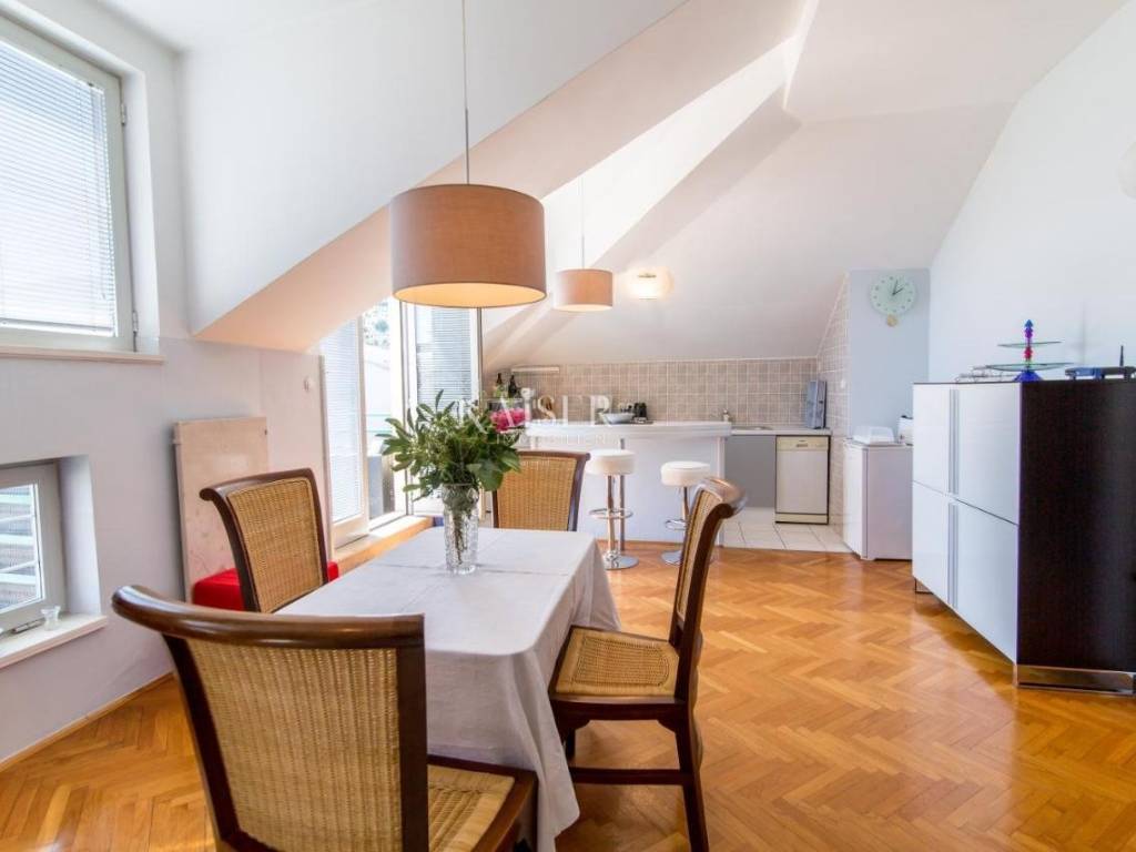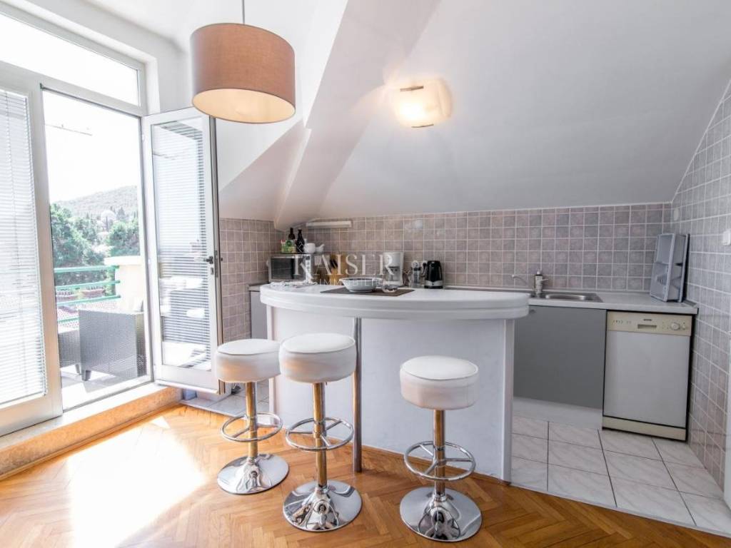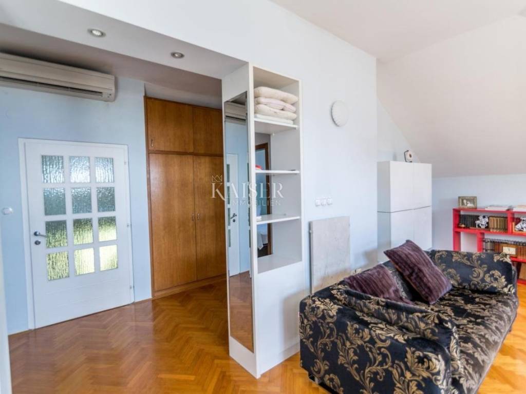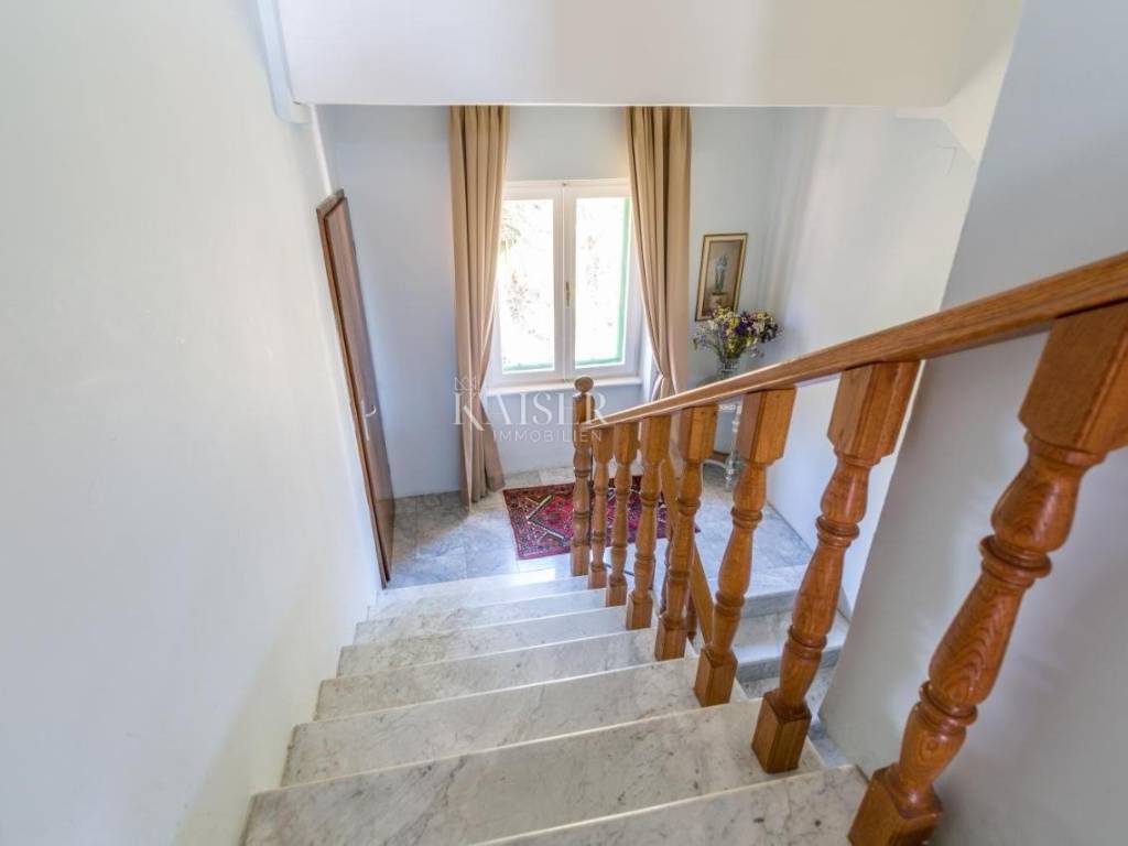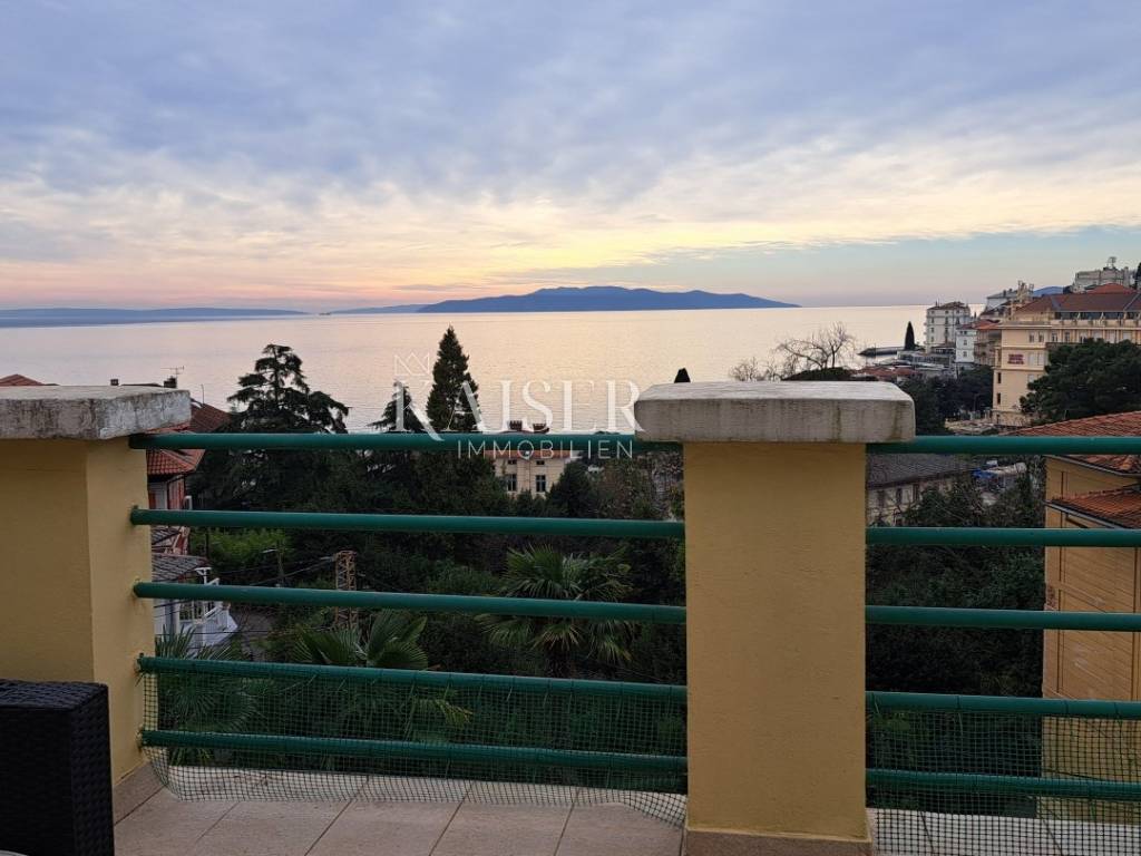 Ulaz u dvoetažni stan uvodi nas stepeništem u prostor koji se sastoji od: 2 spavaće sobe, kuhinje, dnevnog boravka s terasom, kupaone s toaletom i extra toaletom u površni od cca 100 m2.Stubištem, povezana je opisana etaža s etažom u visokom potkrovlju koja se sastoji od:2 spavaće sobe. dnevnog boravka, kuhinje ,kupaone i toaleta i terase s pogledom na Opatijsko zelenilo i more s kupalištima koja su udaljena cca 150 metara od vile ili cca 3 minute hoda. Grijanje je na obje etaže na kamene ploče na struju i klima uređaje za grijanje i hlađenje.