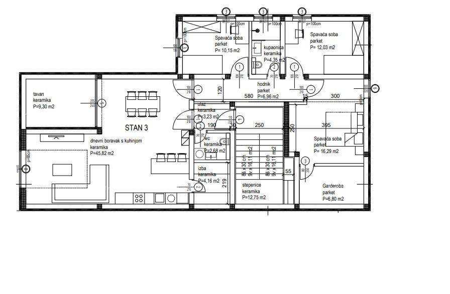 Prodajemo stanovi u zgradi čija izgradnja je započeta u 9-om mjesecu 2023g godine. Projekt se sastoji od dvije spojene zgrade sa ukupno 8 stanova, 3 stanova u jednoj i 5 u drugoj zgradi.Zgrade su u mirnom dijelu Kanfanara okruženo luksuznim vilama dalje od prometnih cesta.Trosoban stan S3 se nalazi na zadnjem katu zgrade od ukupno 3 stanova, jedan stan na svakom katu, ima stambenu površinu od 112.3 m2.Stan se sastoji od slijedećih prostorija:dnevni boravak +kuhinja + blagavaona - 45.82 m2predsoblje - 3.23 m2hodnik - 6.96 m2WC - 2.68 m2kupaonica - 4.35 m2spavaća soba 1 - 10.15 m2spavaća soba 2 - 12.03 m2spavaća soba 3 - 16.20 m2izba/špajza - 4.16 m2garderoba - 6.80 m2tavan - 9.30 m2Stanu pripada 1 parkirno mjesto.Kvalitetna keramika je predviđena u svakoj prostoriji osim spavaćih soba i ulaznog prostora gdje će biti postavljene vrhunske vinil podne obloge.Izgradnja je zapoćeta početkom jeseni 2023 i završetak planira se na kraj 2024 god.Primamo rezervacije!+385 91 611 5706azra@almadominvest.com+385 98 420 885