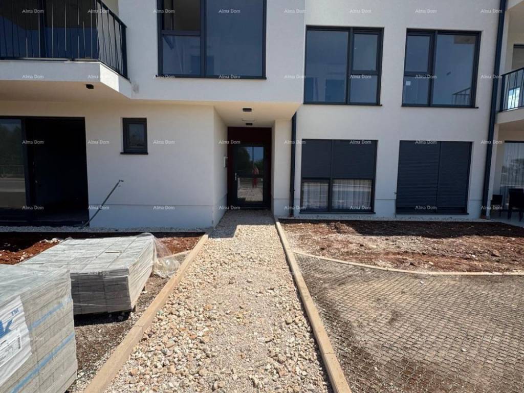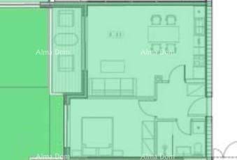 U samom gradu Umagu, u sklopu suvremenog stambenog projekta s  122 stana.Prodaje se stan u prizemlju zgrade, ukupne površine 53,97 m², s terasom, spremištem i parkirnim mjestom. Stan oznake 0-22 nalazi se u prizemlju i sastoji se od:Ulaznog prostoraKupaonicespavaće sobeOtvorenog dnevnog boravka s kuhinjom i blagovaonicomIzlaza na terasu (6,56 m²).Uz stan dolazi i:Spremište (2,6 m²)Parkirno mjesto (12,50 m²)Tehničke karakteristike:Armirano-betonska konstrukcijaTermoizolacijska fasada (ETICS, 10 cm)Visokokvalitetna PVC stolarija, podizno-klizne stijeneElektrične rolete u sobamaMultisplit klimatizacija u svim prostorijamaPrvoklasna keramika i parketVlastito brojilo struje i vodeVideo parlafon, internet i TV priključakZgrada sadrži:74 garažna mjesta, 82 vanjska i 25 natkrivenih parkirnih mjestaUkupno 105 spremištaLift i stubišta iz 4 glavna ulazaPodrumska etaža s garažama i komunikacijomStanovi od 1. do 3. kata.Lokacija:100–500 m od vrtića, škole, dućana, sportskih sadržaja i centra700 m do mora, šetnice i gradske plaže.Završetak radova planiran je krajem 2025. godine.Za više informacija stojimo vam na raspolaganju:Azra +385 91 611 5706 +385 98 420 885 azra@almadominvest.com