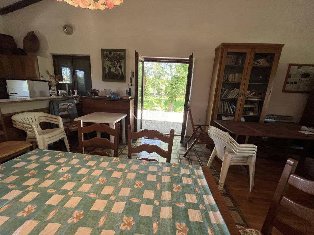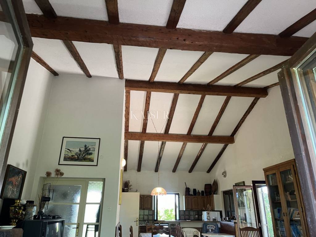 U prizemlju kuće nalazi se dnevni boravak, kuhinja i blagovaona sa visokim stropovima od  5 metara ukrašenim sa drvenim gredama. Iako je kuća sagrađena 1980. godine ima taj open space osjećaj i puno svjetla. Iz tog objedinjenog prostora izlazi se na dvije velike terase.