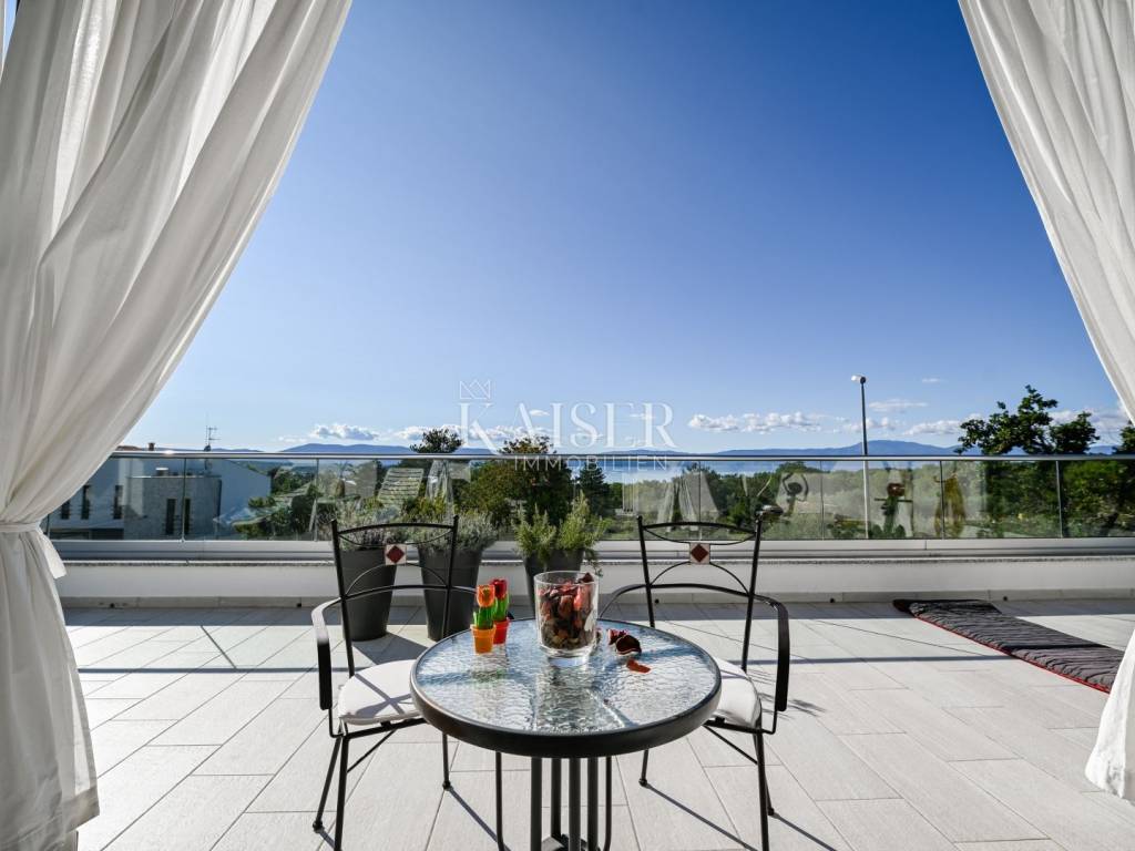 Prvi kat vile, površine 69,82 m², povezan je vanjskim stubištem, što omogućuje poseban ulaz. Ovaj kat obuhvaća predprostor s manjom kuhinjom površine 21 m², idealnom za pripremu laganih obroka. Na katu se nalaze još dvije spavaće sobe, od kojih prva ima površinu od 14,01 m² i vlastitu kupaonicu od 3,85 m², dok druga, malo veća soba od 15,56 m², ima kupaonicu od 3,63 m². Posebnu vrijednost ovog kata čini nenatkrivena terasa od 36,80 m², s koje se pruža prekrasan pogled na more, savršen za opuštanje ili druženja.
