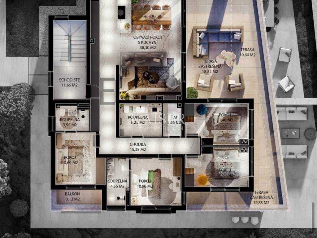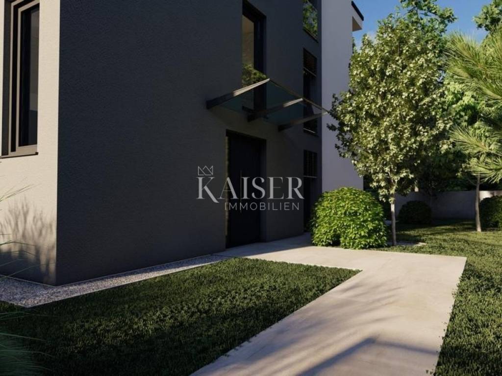 Ulaskom u ovaj raskošni stan, dočekuje vas prostrani ulazni hodnik, elegantno oblikovan kako bi osigurao skladan raspored svih prostorija. On vas vodi u otvoreni dnevni boravak s kuhinjom i blagovaonicom – prostor ispunjen svjetlošću i toplinom, idealan za obiteljska okupljanja i opuštanje. Veliki prozori omogućuju nesmetan pogled na more, dok izlaz na prostranu natkrivenu terasu stvara savršen kutak za uživanje u blagim mediteranskim večerima.