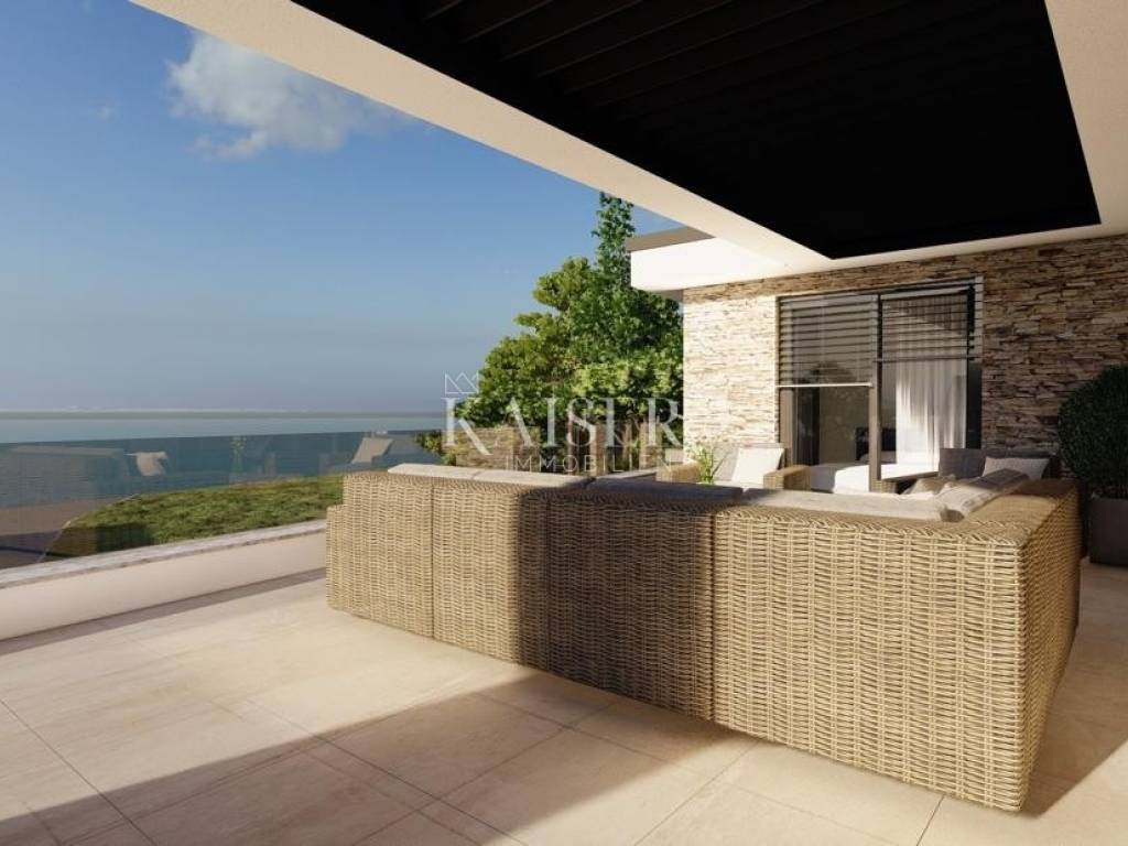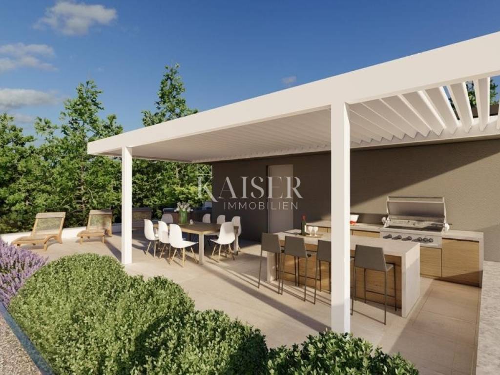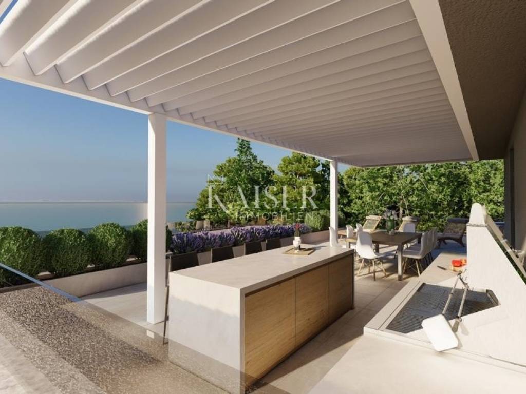 Nenatkrivena terasa omogućuje potpunu privatnost i idealno je mjesto za sunčanje. Natkrivena terasa s pergolom stvorena je za opuštanje, pružajući zaštitu od sunca i uživanje u pogledu. Natkrivena terasa savršena je za objedovanje na otvorenom, dok pogled na more čini svaki trenutak posebnim.