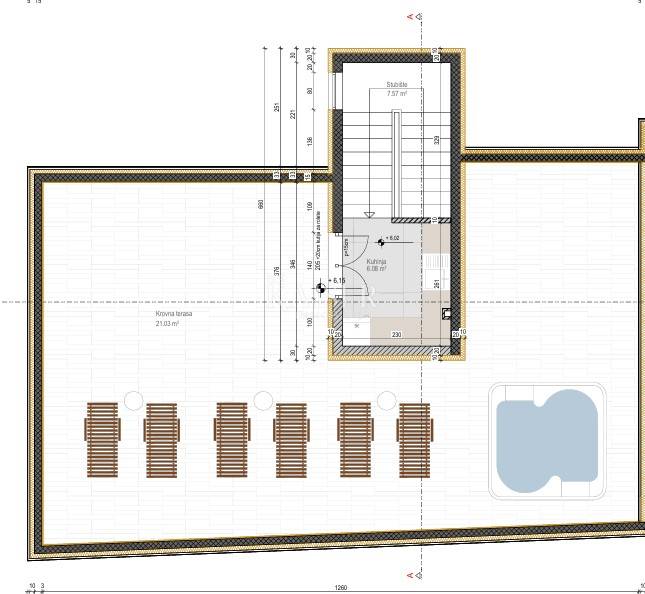 Hodnik i stubište površine 18,82 m² vode na zadnju etažu – krovnu terasu. Tamo se nalazi unutarnja kuhinja veličine 6,08 m² koja se otvara prema terasi površine 21,03 m², s koje se pruža panoramski pogled na more. Na ovoj etaži već su pripremljeni priključci za jacuzzi, čime se omogućuje dodatno luksuzno iskustvo boravka.