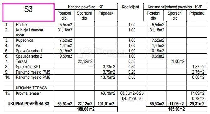 PETRČANE - PENTHOUSE S3 2. KAT S KROVNOM TERASOM I POGLEDOM NA MORE  Zgrada je smještena u mirnom dijelu naselja oko 200m od mora.  Stan S2 nalazi se na drugom katu, sastoji se od ulaznog hodnika, kuhinje, blagovaonice i dnevnog boravka, dvije spavaće sobe, kupaonice i toaleta. Iz dnevnog boravka se izlazi na prostranu terasu od 22,12m2.  Stanu pripada spremište od 3,73m2, 2 parkirna mjesta i velika krovna terasa od 69,78m2. Ukupan unutarnji stambeni prostor bez terasa iznosi 65,53m2, s terasama, parkingom i spremištem stan ima 188,66m2 brutto, odnosno 105,90m2 netto.  Financiranje dostupno za građane EU. Agencija broj jedan u Hrvatskoj već 25 godina.   Za više informacija:  VEDRANA BAŠIĆ  +385919077396 vedrana.basic@dogma-nekretnine.com  ID KOD AGENCIJE: DA100066206  Vedrana Bašić  Asistent u posredovanju Mob: 091/907-7396 Tel: 023/551-400 E-mail: vedrana.basic@dogma-nekretnine.com www.dogma-nekretnine.com