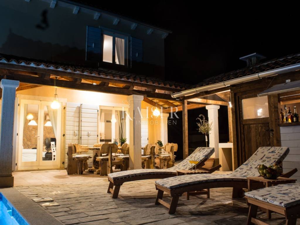 Veliki grijani bazen veličine 35 m2 sa sunčalištem i vanjskim tušem opremljen je predivnom rasvjetom, tako da večernji i noćni sati pružaju izvanrednu priliku za romantična ili prijateljska druženja u idiličnom ambijentu.
