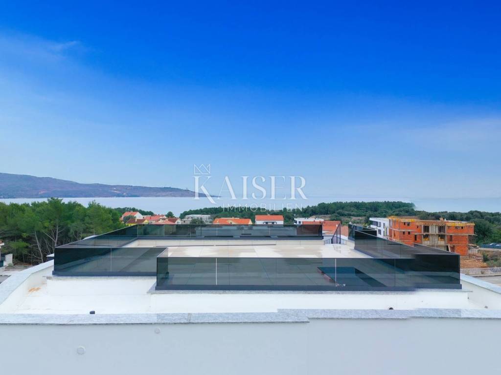 Penthouse sa nalazi na drugom katu dvokatnice u novogradnji na samo 400m od mora. Neto površina iznosi 170m2 i uključuje koncept otvorenog prostora sa boravkom, kuhinjom i blagovaonicom površine 53m2, tri spavaće sobe, tri kupaonice, walk in garderobu, ostavu i balkon površine 38m2. Penthouseu pripada i krovna terasa površine 89m2 sa pripremom za bazen površine 21m2. Iz cijelog stana pruža se predivan pogled na more, dok pogled sa balkona i pogotovo krovne terase oduzima dah. Stanu pripada i spremište u podrumu, te dva parkirna mjesta.