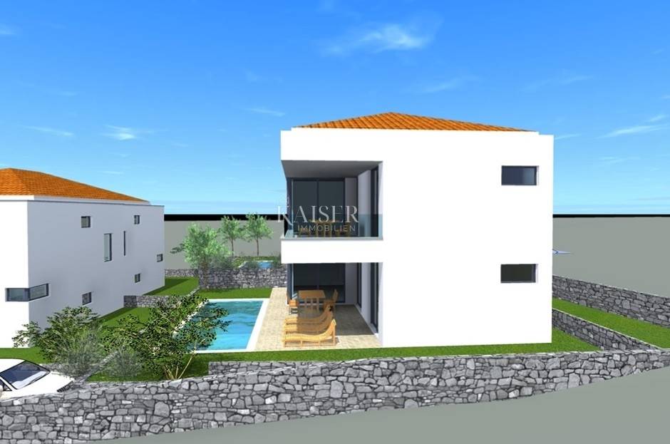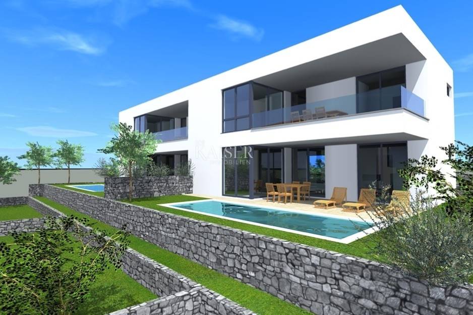 Kaiser immobilien posreduje u prodaji dvojne kuće u novogradnji 600m od mora, Malinska otok Krk.