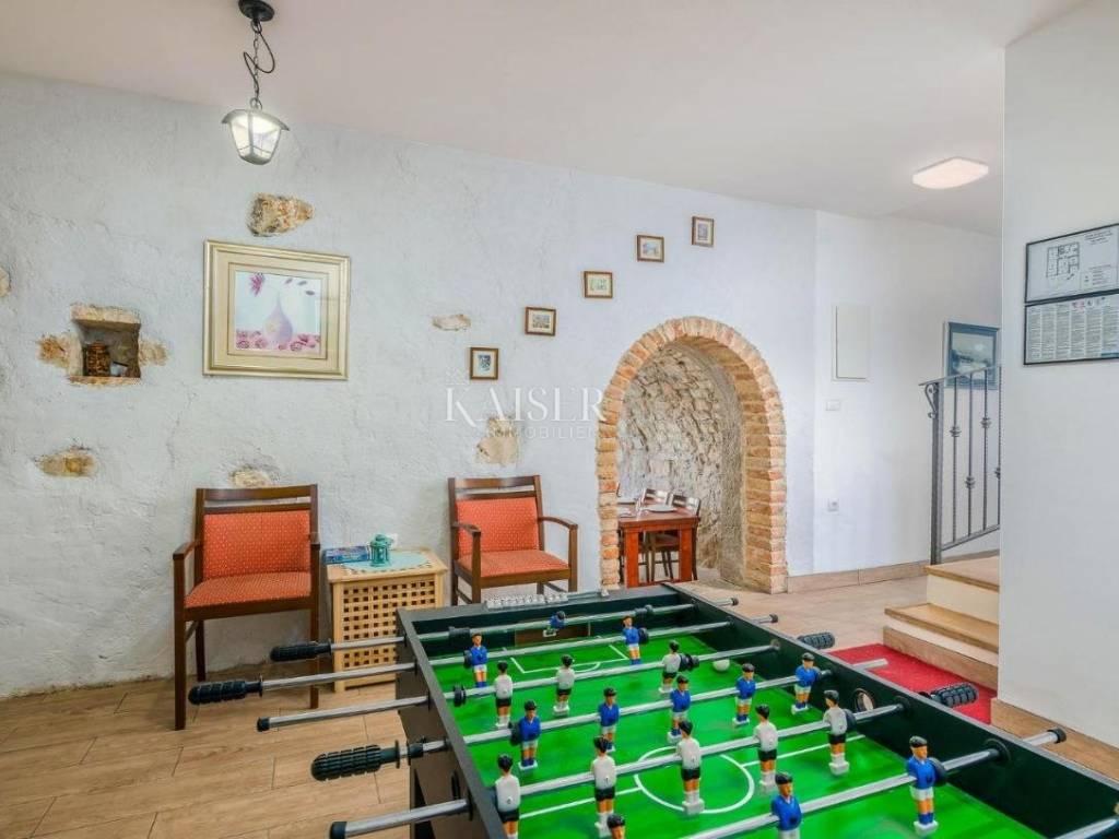 U prizemlju se nalazi prostrani dnevni boravak s klimom, nova i moderna kuhinja, Wc s vešmašinom, dodatna prostorija koja može služiti kao soba za zabavu. U prizemlje se još nalazi šarmantna taverna s još jednom prostorijom, ona može služiti kao ostava. Taverna i Dnevni boravak ima izlaz na veliku natkrivenu terasu na kojoj ima i roštilj.