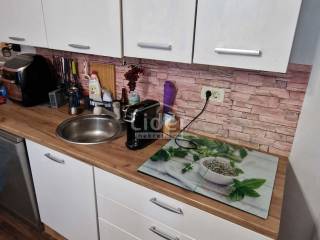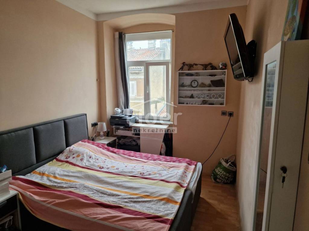 Centar, 2-soban stan sa pogledom na more. Nalazi se u poslovno-stambenoj zgradi, nadomak Korza. Sastoji se od dvije spavaće sobe, hodnika, kupaone, kuhinje s dnevnim boravkom, te dvije izbe odvojene od stana odmah preko puta na glavnom hodniku neposredno uz stan, od čega jedna ostava ima dovod i odvod koje se može staviti u funkciju pa time imati vešeraj neposredno uz stan.