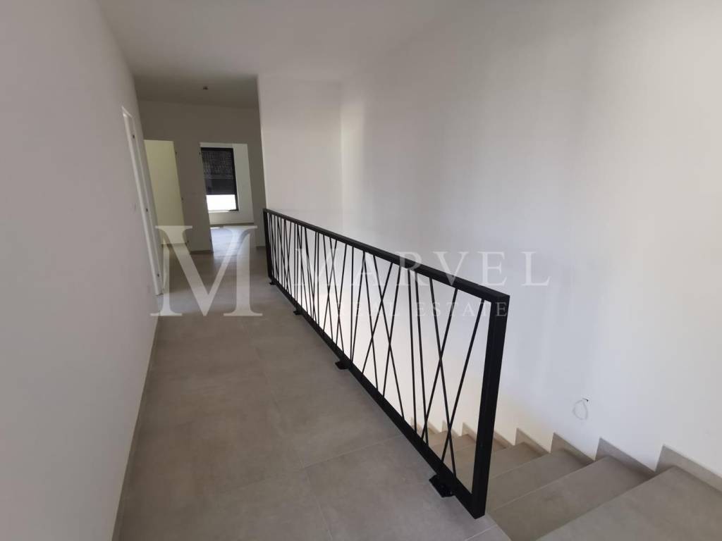 Kuća se prostire na dvije etaže povezane unutarnjim stepeništem. Na prvom katu nalaze se četiri prostrane spavaće sobe, od kojih dvije imaju vlastite kupaonice i garderobe, dok preostale dvije dijele zajedničku kupaonicu. Tri sobe imaju izlaz na prostrani balkon koji se proteže cijelom dužinom prvog kata, pružajući spektakularan pogled na more.