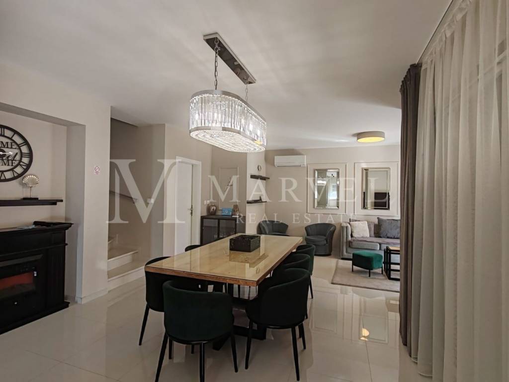 Na prodaju je moderno uređena dvojnica površine 120 m smještena na mirnoj lokaciji u Malinskoj, svega 3 minute hoda od mora i plaže, te 15 minuta šetnje uz obalu do samog centra.