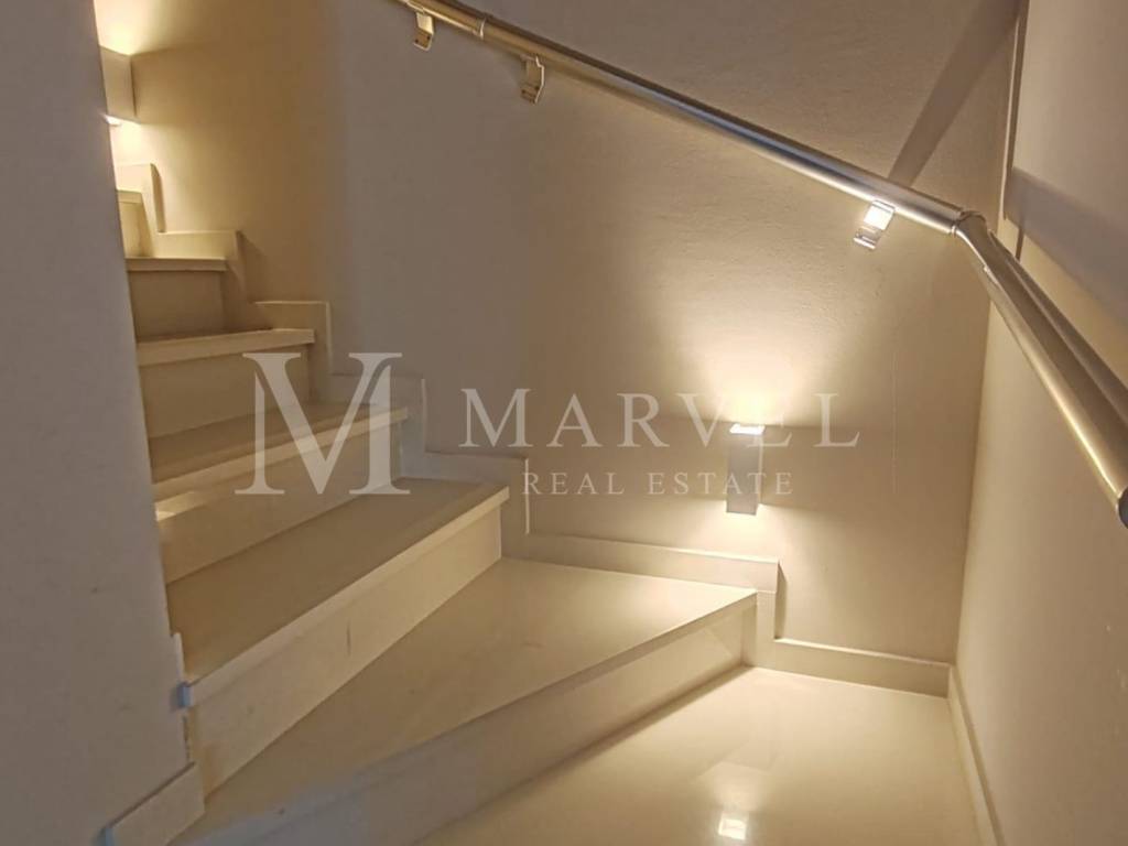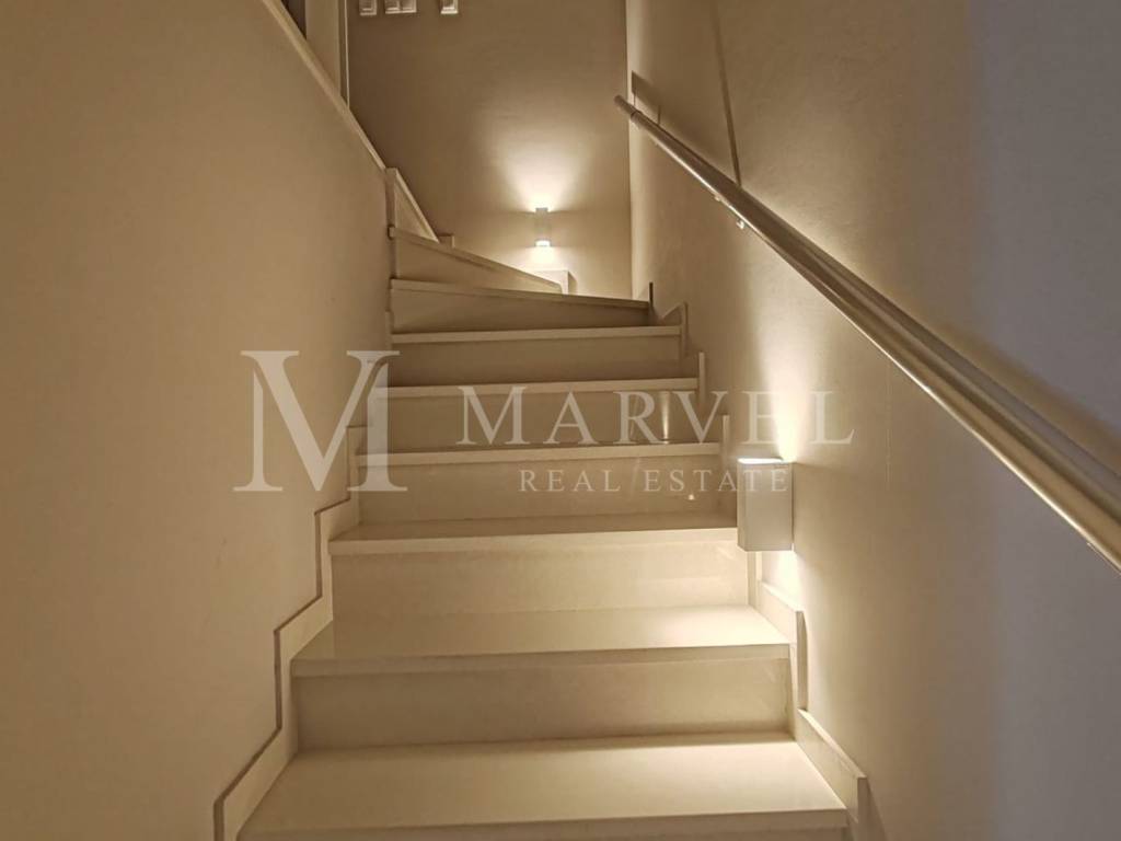 Kameno stepenište sa staklenom ogradom vodi na prvi kat gdje se nalaze glavna spavaća soba s vlastitom kupaonicom, dječja soba s dva kreveta na kat, dodatna spavaća soba i prostrana kupaonica. Sve tri sobe imaju izlaz na terasu s koje se pruža djelomičan pogled na more.