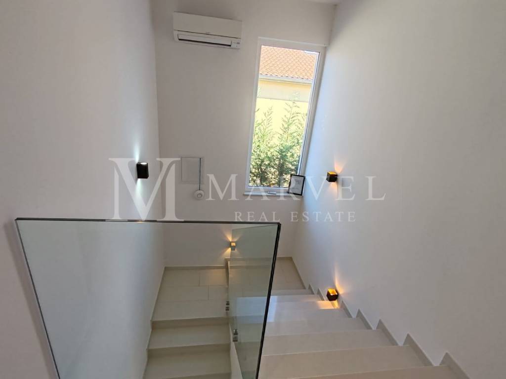 Kuća je u potpunosti namještena kvalitetnim, luksuznim namještajem rađenim po mjeri. Pripadaju joj dva natkrivena parkirna mjesta, a na okućnici površine 172 m nalazi se uređeni kamin te je moguće parkirati još barem dva vozila.