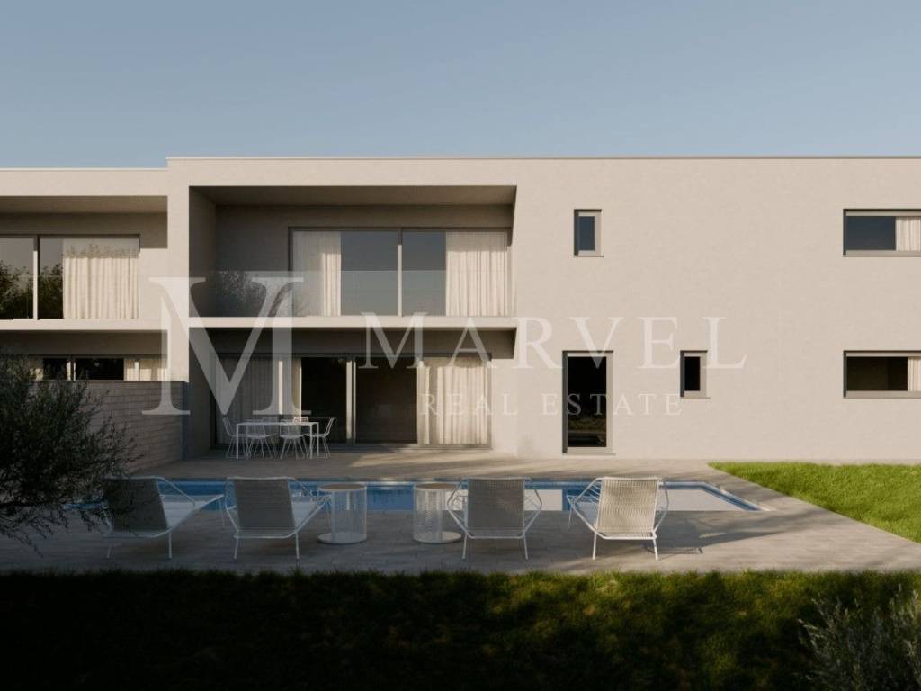 Ova dvojna kuća, smještena samo 800 m od mora, nudi lijep pogled na more. Kuća se sastoji od prizemlja i kata. U prizemlju su sauna s tušem, vešeraj, toalet, spavaća soba s kupaonom, kuhinja i dnevni boravak s izlazom na terasu i okućnicu s bazenom od 40 m. Na prvom katu smještene su 3 spavaće sobe, svaka s vlastitom kupaonom i balkon.