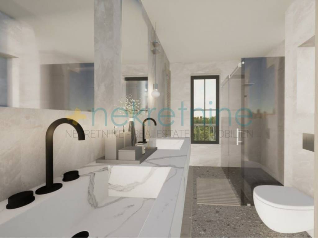 Kupaonska oprema je vrhunske kvalitete, s modernim sanitarijama i armaturama poznatih proizvođača, osiguravajući funkcionalnost i luksuz.