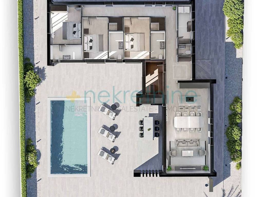 Vanjski Prostor: Prostrani bazen i uređeno dvorište pružaju osjećaj privatnosti i luksuza, savršeni za uživanje u dugim, toplim danima.