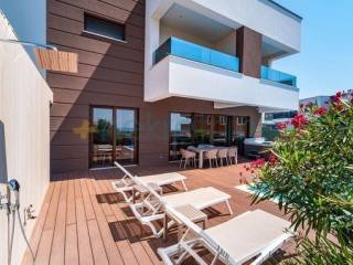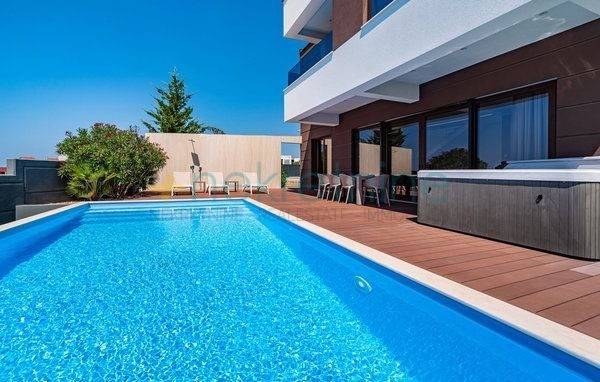 Moderna vila u Novalji na otoku Pagu oduševljava svojim sofisticiranim i elegantnim dizajnom. Smještena nedaleko od mora, ova luksuzna vila pruža prekrasan pogled na Jadransko more i okolni krajolik, kombinirajući udobnost i suvremeni stil života.