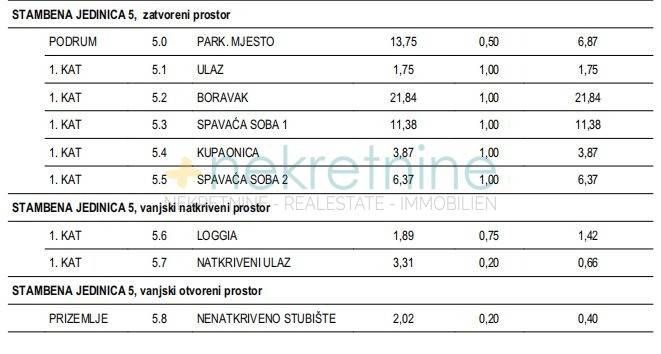 Na prodaju stan S5 u Povljani na otoku Pagu, u modernoj novogradnji koja je odmah useljiva. Stan se nalazi na prvom katu i ima ukupnu obračunsku površinu od 68,65 m. Sastoji se od ulaza (1,75 m), prostranog dnevnog boravka (21,84 m), dvije spavaće sobe (11,48 m i 6,37 m) te kupaonice (3,87 m). Dodatnu vrijednost stanu daju natkrivena loggia, natkriveni ulaz te vanjski prostori velika terasa na tlu (48,43 m), vlastito uređeno zelenilo (44,00 m), nenatkriveno stubište te vlastito parkirno mjesto u podrumu zgrade.