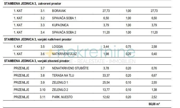 Na prodaju stan S3 u Povljani na otoku Pagu, u novogradnji koja je odmah useljiva. Stan se nalazi na prvom katu te ima ukupnu obračunsku površinu od 66,08 m. Sastoji se od dnevnog boravka (27,73 m), dvije spavaće sobe (6,50 m i 11,20 m), kupaonice (3,79 m), natkrivene loggie (3,44 m) i natkrivenog ulaza. Uz stan dolaze i vanjski prostori u prizemlju: prostrana terasa od 33,37 m, uređeno zelenilo, nenatkriveno stubište te vlastito parkirno mjesto. Smješten u mirnom dijelu Povljane, na samo 250 metara od mora, stan je idealan za obiteljski život, odmor ili kao investicija za turistički najam. Blizina plaža, prirodno okruženje i kvalitetna gradnja čine ovu nekretninu izvrsnom prilikom. Za sve dodatne informacije i razgledavanje, slobodno nas kontaktirajte.
