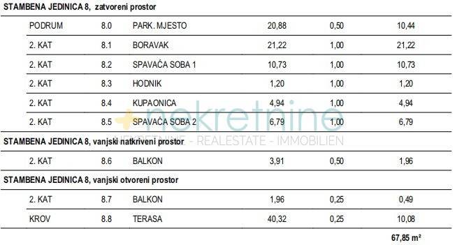 Prodaje se stan S8 u modernoj novogradnji u Povljani na otoku Pagu, udaljen svega 250 metara od mora. Stan se nalazi na 2. katu zgrade i ima ukupnu obračunsku površinu od 67,85 m. Sastoji se od dnevnog boravka (21,22 m), dvije spavaće sobe (10,73 m i 6,79 m), kupaonice (4,94 m) i hodnika (1,20 m). Uz unutarnji prostor, stan ima dva balkona jedan natkriveni (3,91 m) i jedan nenatkriveni (1,96 m), kao i prostranu privatnu krovnu terasu površine 40,32 m, idealnu za uživanje na otvorenom. Stanu pripada i vlastito parkirno mjesto u podrumu zgrade (20,88 m). Stan je funkcionalno raspoređen, pun prirodnog svjetla i idealan za odmor, cjelogodišnje stanovanje ili turistički najam. Smješten u mirnoj zoni, u blizini plaže, trgovina i svih potrebnih sadržaja, stan S8 predstavlja odličnu investiciju na atraktivnoj lokaciji. Za više informacija i razgledavanje, slobodno nas kontaktirajte.