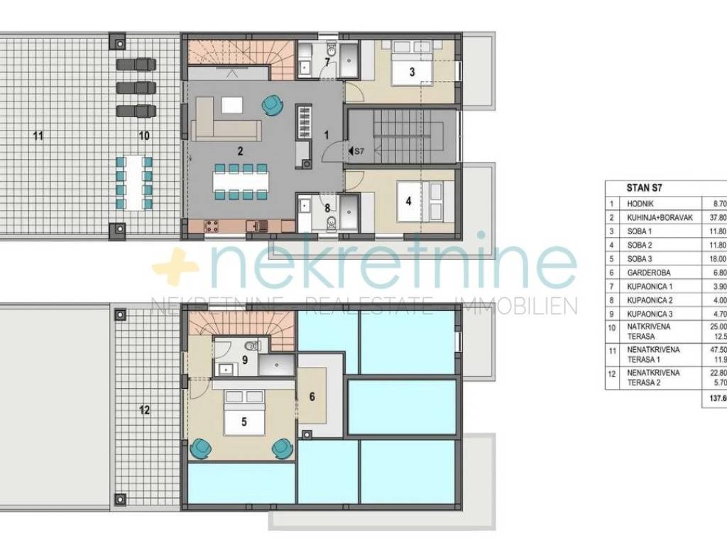 Prodaje se ekskluzivni dvoetažni četverosobni penthouse apartman (S7) ukupne površine 137,60 m, smješten u vrhu moderne novogradnje u mirnom naselju Mandre na otoku Pagu. Ova luksuzna nekretnina prostire se na dvije etaže i nudi funkcionalan raspored idealan za veću obitelj, odmor ili prestižan najam.
