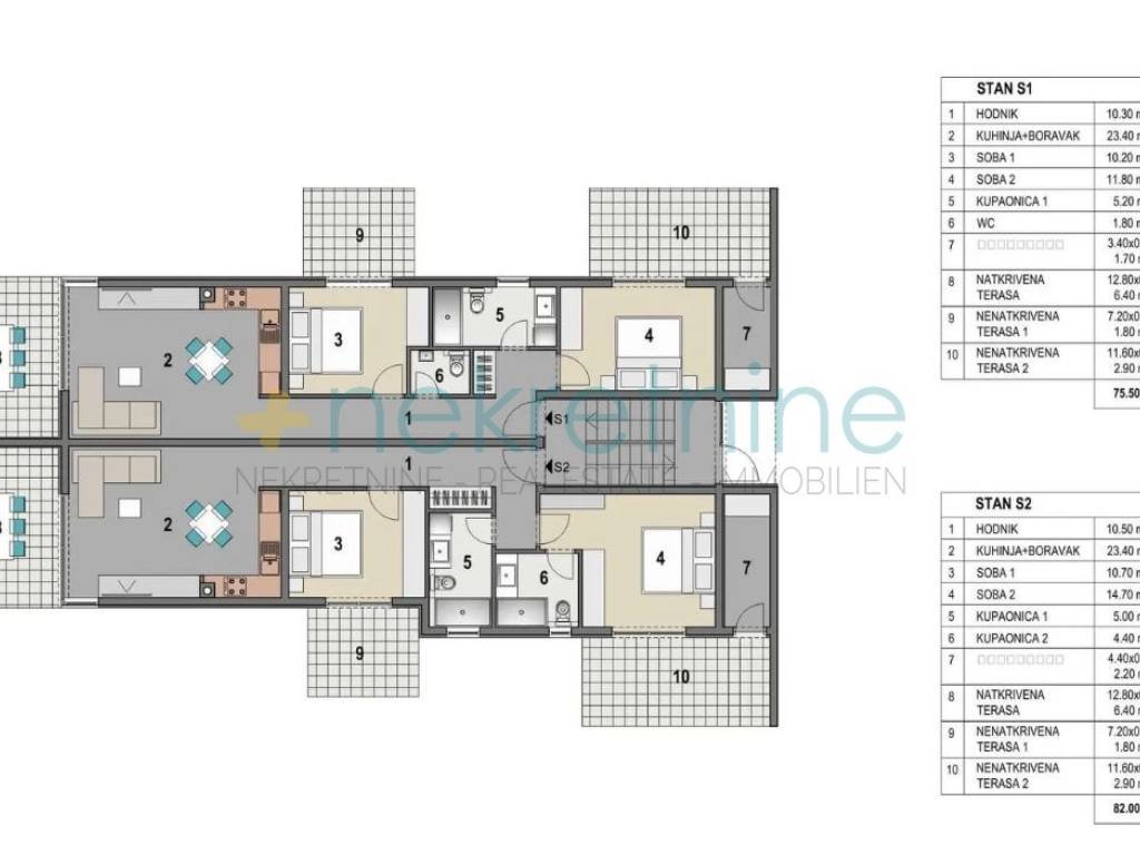 Prodaje se atraktivan trosobni apartman (S1) površine 75,50 m, smješten u prizemlju moderne novogradnje u mirnom dijelu Mandri na otoku Pagu. Apartman se sastoji od hodnika, dvije spavaće sobe, kupaonice s WC-om, dodatnog WC-a, male ostave, te prostranog dnevnog boravka s kuhinjom i blagovaonicom. Poseban adut ovog stana su čak tri natkrivene terase i vrt površine 151,40 m (obračunski 15,40 m), što ukupno čini obračunsku površinu od 90,90 m.