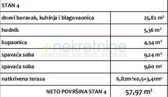 Stan S4 nalazi se na prvom katu zgrade C i sastoji se od ulaznog hodnika (5,36 m), dnevnog boravka s kuhinjom i blagovaonom (25,82 m), dvije spavaće sobe (9,24 m i 9,60 m), kupaonice (4,54 m) te natkrivene terase površine 6,82 m (obračunski 3,41 m). Neto površina stana iznosi ukupno 57,97 m. Stanu pripada i vanjsko parkirno mjesto unutar okućnice zgrade.