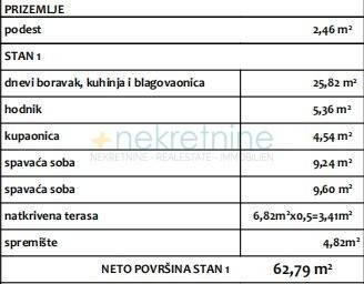 Stan S1 nalazi se u prizemlju zgrade C i sastoji se od ulaznog hodnika, prostranog dnevnog boravka s kuhinjom i blagovaonom (25,82 m), dvije spavaće sobe (9,24 m i 9,60 m), kupaonice (4,54 m), spremišta (4,82 m) te natkrivene terase površine 6,82 m (obračunski 3,41 m). Neto površina stana iznosi ukupno 62,79 m. Stanu pripada i vanjsko parkirno mjesto unutar okućnice zgrade.