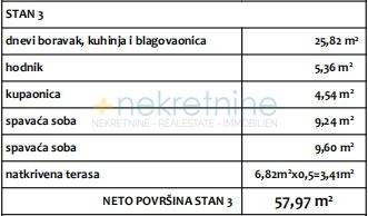 Stan S3 nalazi se na 1. katu zgrade C i sastoji se od ulaznog hodnika (5,36 m), dnevnog boravka s kuhinjom i blagovaonom (25,82 m), dvije spavaće sobe (9,24 m i 9,60 m), kupaonice (4,54 m) te natkrivene terase površine 6,82 m (obračunski 3,41 m). Neto površina stana iznosi ukupno 57,97 m. Stanu pripada i vanjsko parkirno mjesto unutar okućnice zgrade.