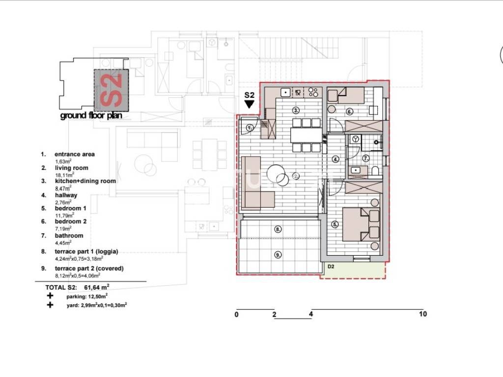 Stan se sastoji od dvije spavaće sobe, dnevnog boravka te je orijentiran prema jugozapadu, što mu omogućuje obilje prirodnog svjetla tijekom cijelog dana. Prostor je pažljivo dizajniran kako bi pružio udobnost i funkcionalnost, s posebnim naglaskom na dizajnerske detalje i uređenost okućnice.