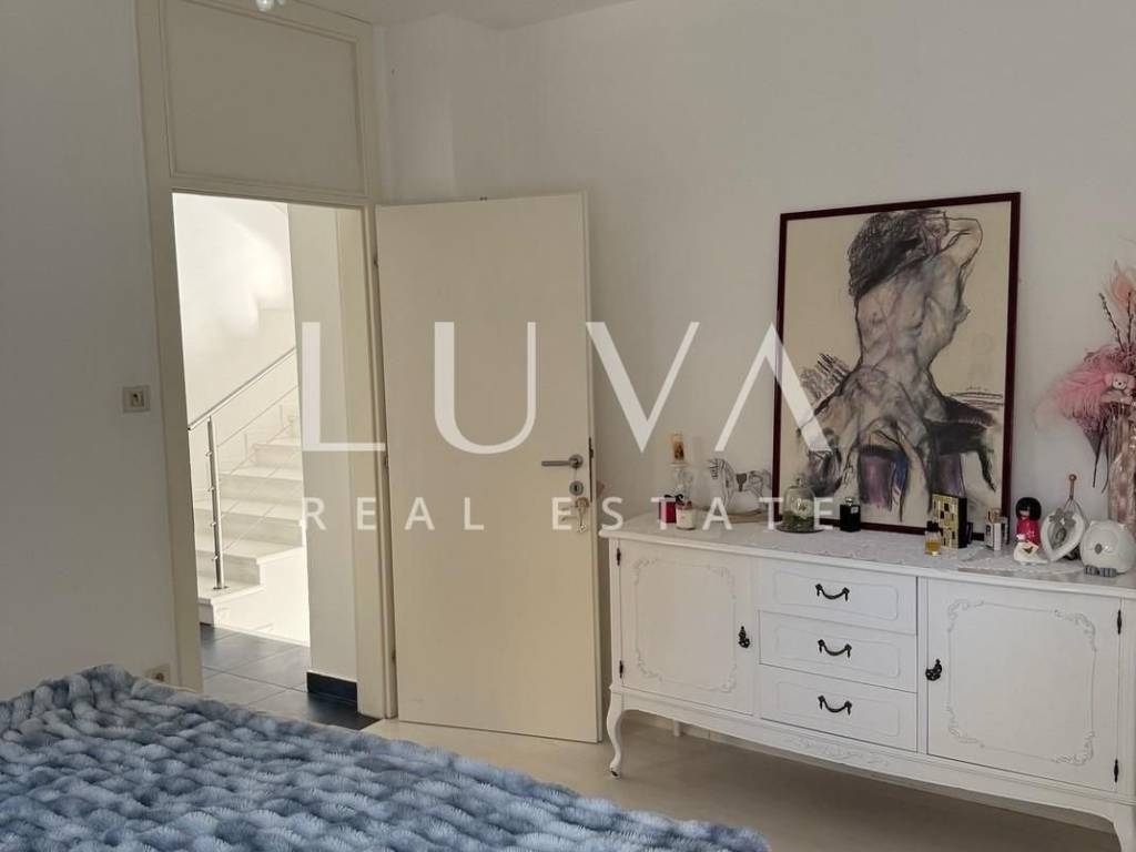 U podrumu se nalazi ostava. Prostrani dnevni boravak koji se kroz staklene stijene otvara prema terasama i zelenilu stvara harmoniju interijera i eksterijera, nudeći luksuznu prozračnost i maksimalan komfor, a kuhinja se u svom otvorenom konceptu savršeno nadovezuje na blagovaonicu, stvarajući fluidan i funkcionalan prostor idealan za svakodnevni život i druženja. Iz svih prostorija može se izaći u bajkoviti, prostrani vrt. Na polukatu imamo jednu spavaću sobu i kupaonu, a na prvom katu dvije spavaće sobe, te još jednu kupaonu i walk in garderobu.
