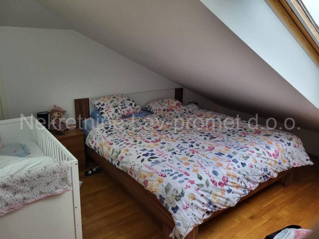 Potkrovlje daje stanu poseban šarm, toplinu i obilje prirodnog svjetla. Kosine su pametno iskorištene kao dodatne spremišne zone, što prostoru dodaje funkcionalnost i osjećaj prostranosti.