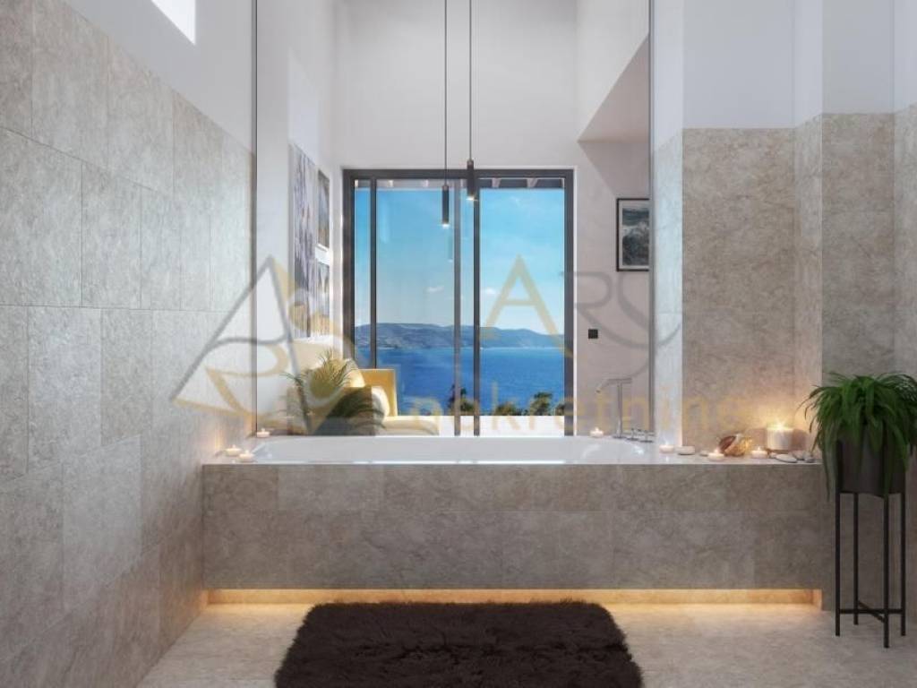 Gornja etaža se sastoji od prostranog, svijetlog dnevnog boravka sa stilskom kuhinjom i pogledom na tirkizno more. Terasa, koja je natkrivena cijelom dužinom objekta, služi kao ekskluzivni vanjski dnevni boravak, okružen 13-metarskim infinity bazenom (grijanje po želji). Uživajte u ostatku dana u mediteranskom stilu na otvorenom pod zasjenjenom pergolom s vanjskom kuhinjom.