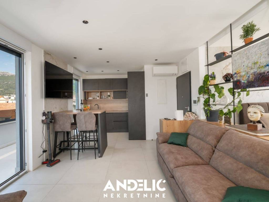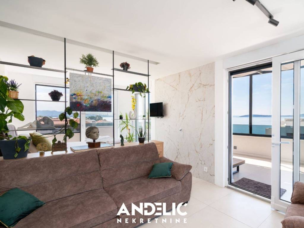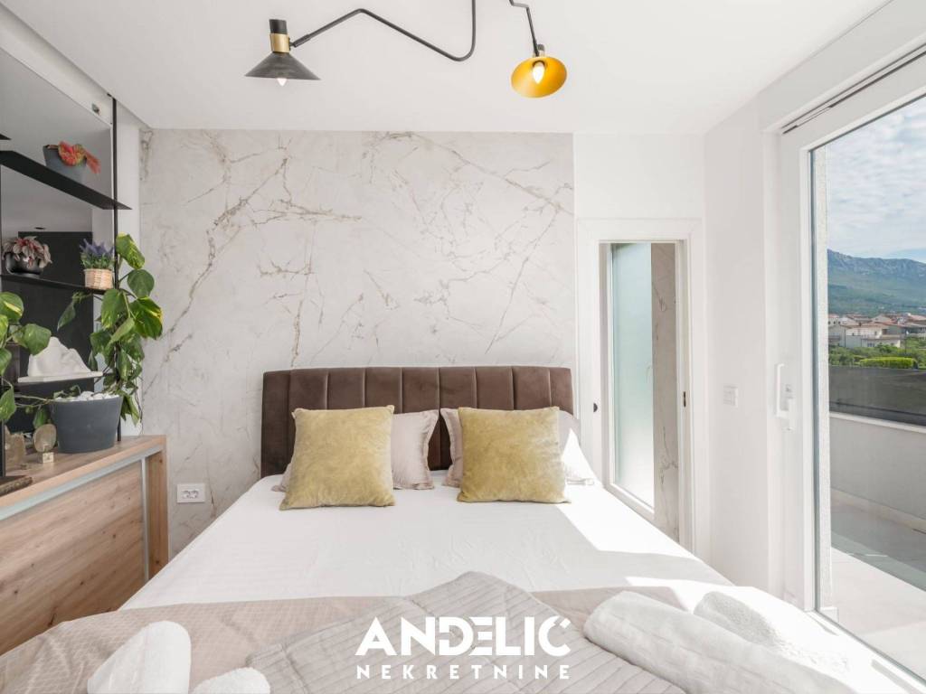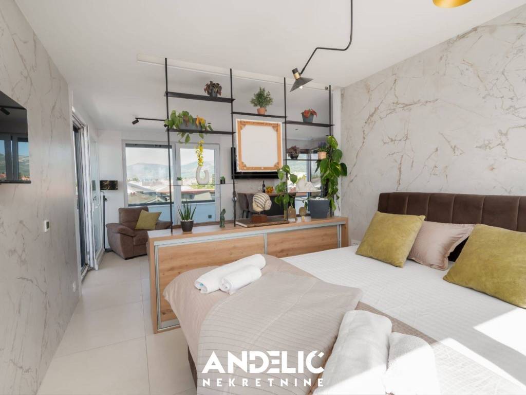 Luksuzan stan u novogradnji sastoji se odjedne spavaće sobe, kuhinje sa blagovaonicom i dnevnog boravka,kupaonice, predprostora, ukupne unutarnje površine od 36 M2.Stan se nalazi na 3 katu novoigrađene zgrade, koji je ujedno i zadnji kat. Stan ima nenatkrivenu terasu od107M2, ozelenjeni vrt od 74 M2, dvaunutarnja garažna mjesta svako po 11 M2, te dva vanjska parking mjesta, sveukupne površine 250 M2.Smješten je na izvrsnoj lokacji, u blizine predivne plaže, ugostiteljskih lokala i svih potrebnih sadržaja.