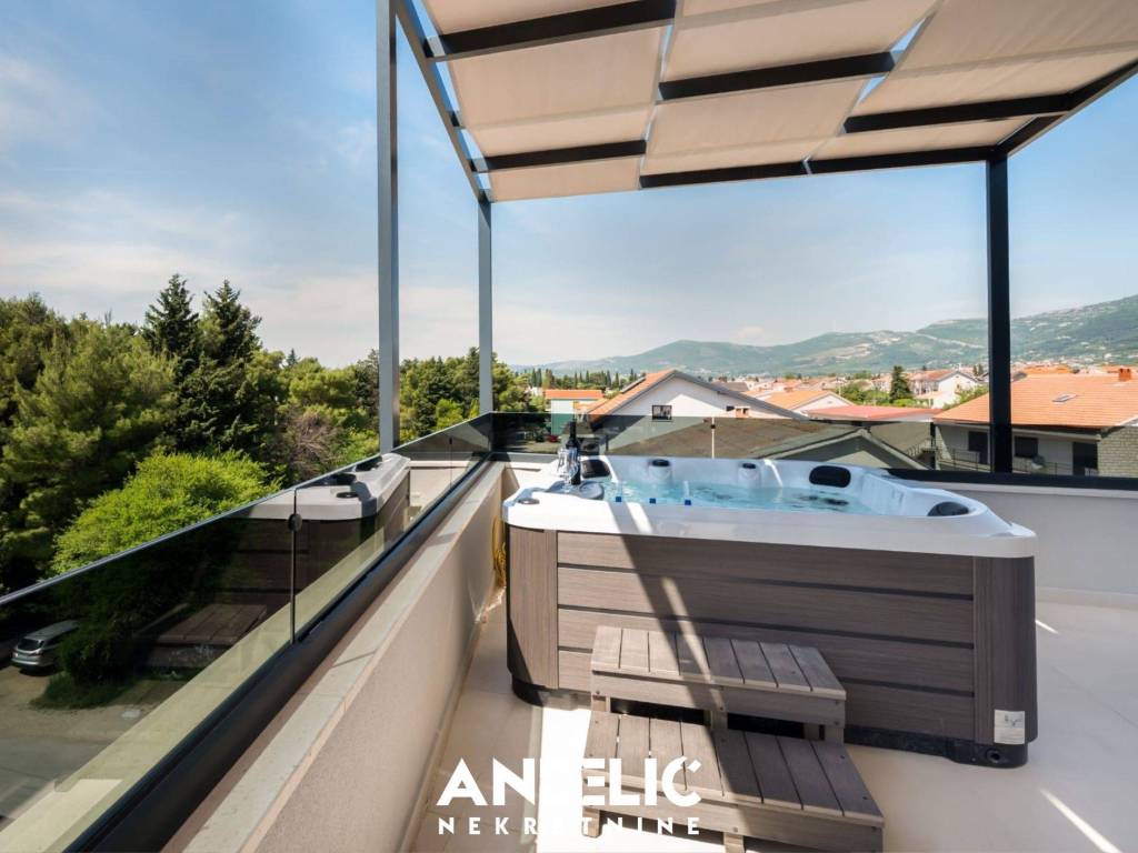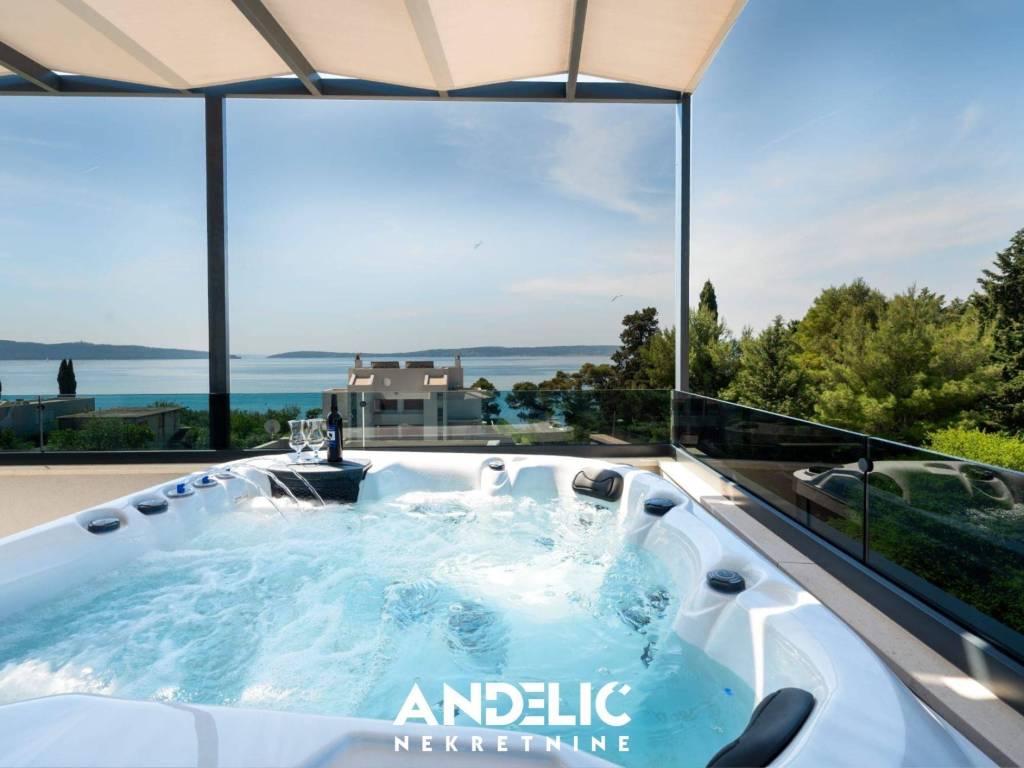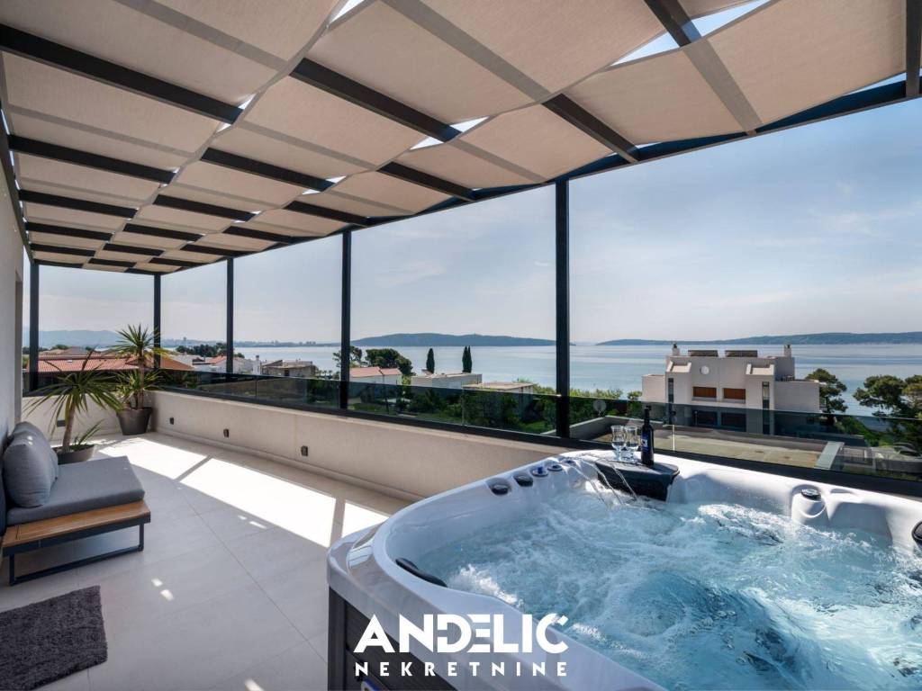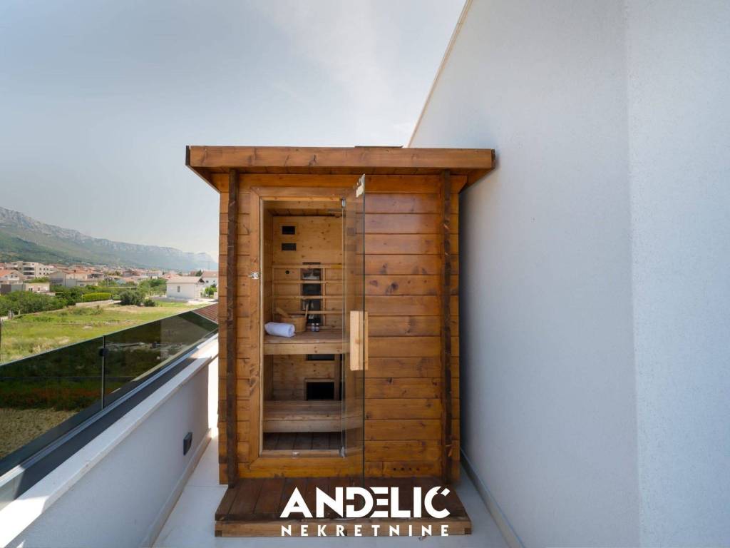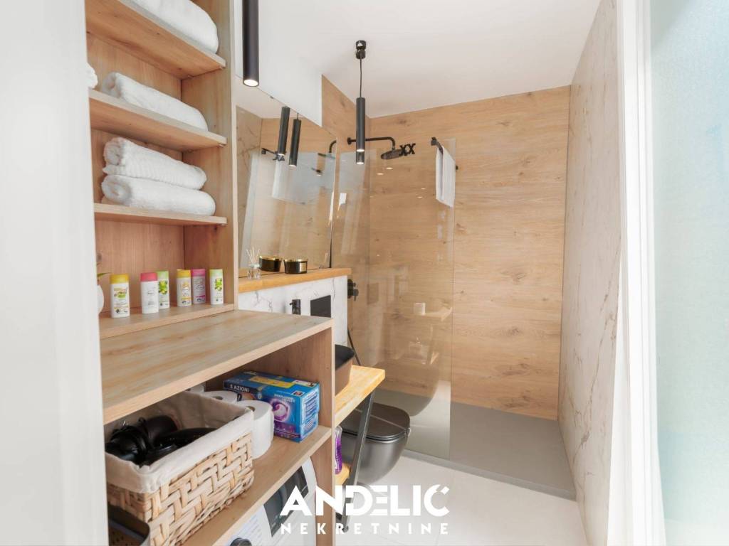 Luksuzan stan u novogradnji sastoji se odjedne spavaće sobe, kuhinje sa blagovaonicom i dnevnog boravka,kupaonice, predprostora, ukupne unutarnje površine od 36 M2.Stan se nalazi na 3 katu novoigrađene zgrade, koji je ujedno i zadnji kat. Stan ima nenatkrivenu terasu od107M2, ozelenjeni vrt od 74 M2, dvaunutarnja garažna mjesta svako po 11 M2, te dva vanjska parking mjesta, sveukupne površine 250 M2.Smješten je na izvrsnoj lokacji, u blizine predivne plaže, ugostiteljskih lokala i svih potrebnih sadržaja.