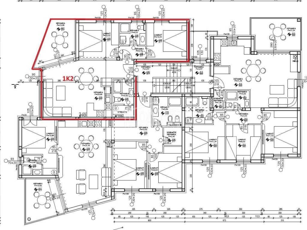Stambena jedinica 1K2 nalazi se na 1. katu zgrade, orijentirana je na jugozapad i ima 78,70 m² korisne površine. U prednjem dijelu stana nalazi se prostrana kuhinja s blagovaonicom i dnevni boravak sa izlazom na terasu površine 10,02m2 sa koje se pruža pogled na more, dvije spavaće sobe, dvije kupaonice, ostave. Stanu pripada jedno parkirno mjesto.
