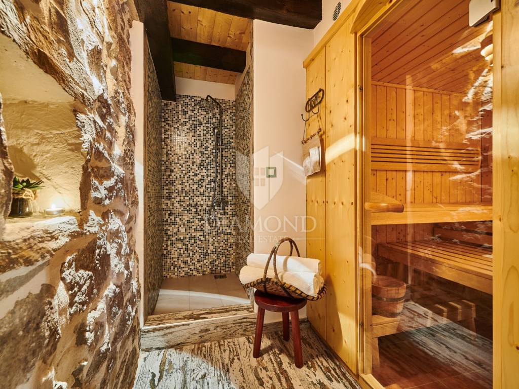 Ova predivna kuća u potpunosti je renovirana s iznimnim osjećajem za detalj i sklad između tradicionalne arhitekture i modernih potreba. U prizemlju se nalazi dnevni boravak s autentičnim ognjištem koji odiše toplinom i karakterom, kuhinja s blagovaonicom, gostinjski toalet te unutarnji bazen sa SPA zonom – pravi kutak za opuštanje tijekom cijele godine. Na katu su tri spavaće sobe, uključujući prostranu „family“ sobu s dodatnim ležajem, te tri elegantne kupaonice.