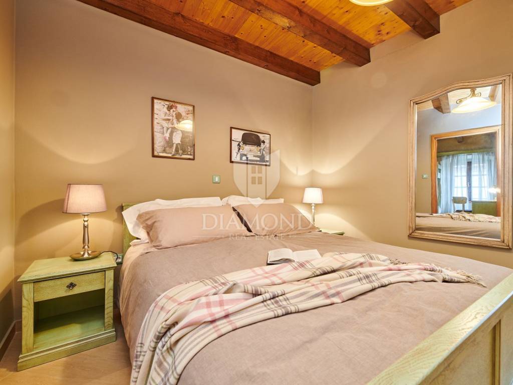 Vanjski prostor jednako je dojmljiv: natkrivena terasa s kamenim kaminom poziva na druženje i večere pod zvjezdanim nebom, dok bazen i sunčalište stvaraju pravu oazu mira. Dvorište, popločeno autentičnim kamenim pločama i ograđeno zidom, pruža potpunu privatnost, a pažljivo odabrani materijali – lokalni kamen, drvo i opeka – daju cijeloj kući poseban istarski šarm. Vila je potpuno opremljena, klimatizirana i kategorizirana za turistički najam, s već uhodanim poslovanjem, što omogućuje trenutni nastavak djelatnosti i siguran povrat investicije.