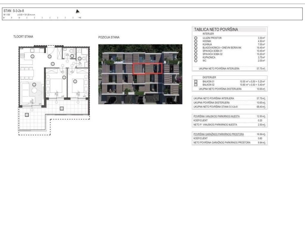 Na samo 10 minuta od centra Omiša, dostupni su dvosobni stanovi u novoizgrađenoj zgradi. Dvosobni stan s jugozapadnom orijentacijom sastoji se od ulaznog prostora i hodnika, prostrane dnevne sobe s blagovaonicom, kuhinje, dvije spavaće sobe, kupaonice, WC-a te dva balkona. Neto površina zatvorenog dijela stana iznosi 57,75 m², pružajući funkcionalan i udoban prostor za stanovanje. Apartmani sadrže čak dva prostrana balkona površine 10,50 m2 nudeći mnoštvo prostora za uživanje u pogledu na more. Stanovi će biti dovršeni do faze potrebne za dobivanje uporabne dozvole, uključujući sve završne radove na završnoj obradi, instalacijama i uređenju prostora. · izvedene će biti sve elektroinstalacije, uključujući priključke i rasvjetu · instalacije vodovoda i odvodnje bit će dovršene, s pravilnom funkcionalnošću · ugrađeni će biti sve sanitarije, uključujući WC školjku, umivaonik s pripadajućim elementom, ogledalom i tuš kadom · zidovi i stropovi bit će završno obrađeni i obojani · podovi će biti završeni s ugradnjom pločica i parketa · uključeni su klimatizacijski uređaji za grijanje i hlađenje · unutarnja vrata će biti postavljena i dovršena, u skladu s projektom Namještaj, poput kuhinje i uređaja, ormara i ostalih elemenata za opremanje unutrašnjosti, kupci će morati zasebno nabaviti i instalirati sami, jer se stan prodaje kao dovršen i spreman za useljenje, bez dodatnog namještaja ili elemenata. Dostupni su stanovi identičnog tlocrta na prvom drugom i trećem katu po cijenama: 1. Kat – 252.637 € 2. Kat – 270.180 € 3. Kat – 283.860 € Budući vlasnici imaju mogućnost kupnje garažnog mjesta po cijeni od 22.000 € ali i vanjskog parkirnog mjesta po cijeni od 17.000 €. Dodatne stanove u zgradi nešto drugačijeg tlocrta možete pronaći pod šiframa nekretnine 2041/122 i 2041/124 Potpuni završetak radova je planiran do kraja 2026 godine. Zgrada se nalazi u blizini svih sazdržaja potrebnih za život a udaljenost od samo 5 minuta do mora i prekrasnih plaža, čini ove stanove vrijednom investicijom bilo da se radi o turističkom poslovanju ili korištenju za osobnu upotrebu.