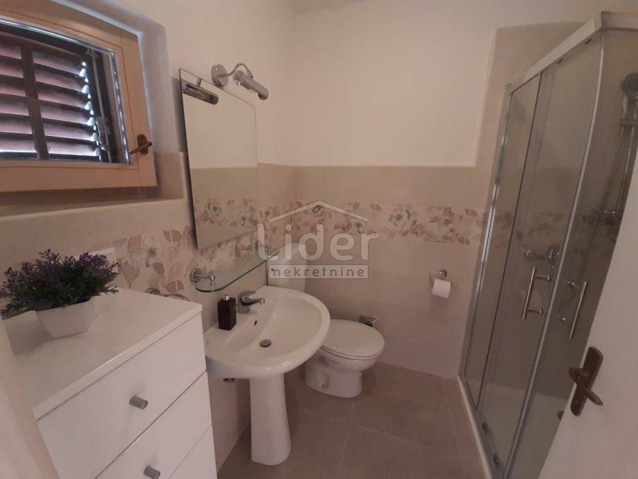 Sastoji se od prostranog hodnika, dvije spavaće sobe, kupaonice, kuhinje s blagovaonicom i dnevnim boravkom, sa izlazom na prostranu terasu i uređeni vrt.