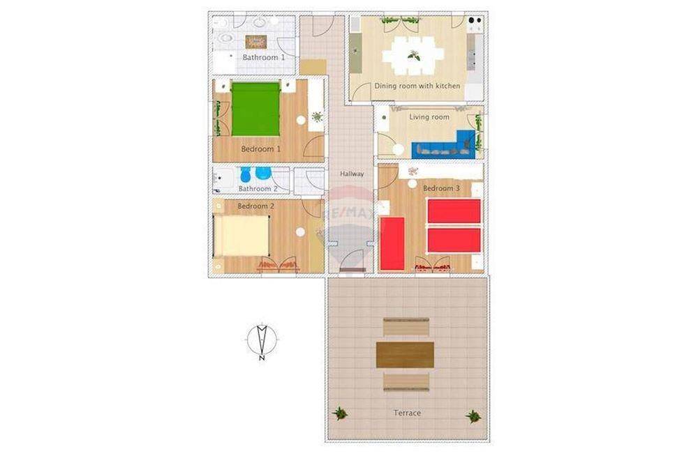 Hodnik, lijevo iz hodnika seulazi u kupaonu i 2 dvokrevetne spavaće sobe a desno je kuhinja sa blagovaonom, dnevni boravak, spavaća soba i prostrana terasa.
