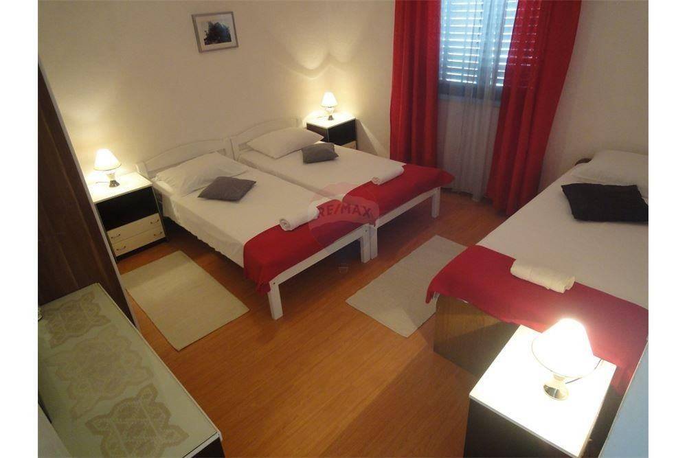 Na katu je: veliko predsoblje sa ostavom, lijevo je kuhinja sa dnevnim boravkom, kupaonom i balkonom a desno 2 dvokrevetne spavaće sobe sa balkonima.
