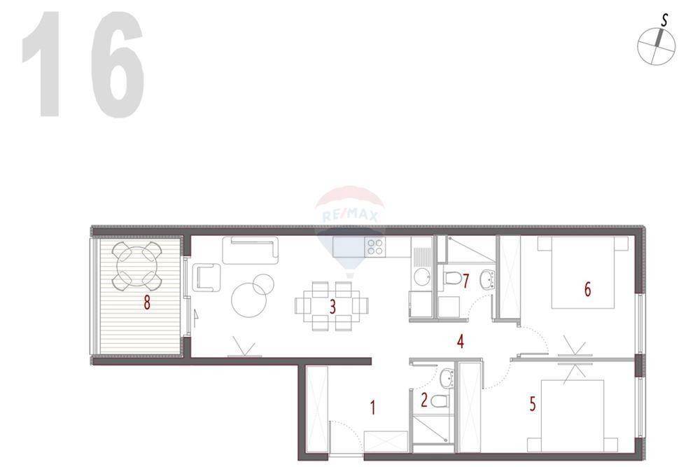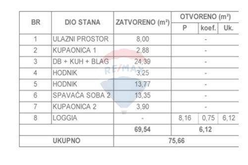 Stan oznake S16, 1 kat, orijentacije istok-zapad, sastoji se od sveukupno 77,70 m2 (75,66 m2 neto):
