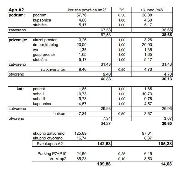 Ukupna obračunska površina nekretnine iznosi 117,45 m2. U cijenu su uključena i dva parkirna mjesta te pripadajući vrt.