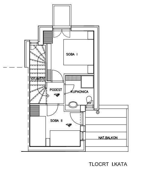 2. Prvi kat obuhvaća dvije udobne spavaće sobe, modernu kupaonicu te natkriveni balkon koji dodatno oplemenjuje prostor.