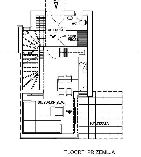 1. Prizemlje se sastoji od ulaznog prostora, spremišta, gostinjskog WC-a, prostranog dnevnog boravka s kuhinjom i blagovaonicom u otvorenom konceptu, elegantno povezanih s natkrivenom terasom i dvorištem površine 85,28 m2, u kojem se nalazi i kameni roštilj.