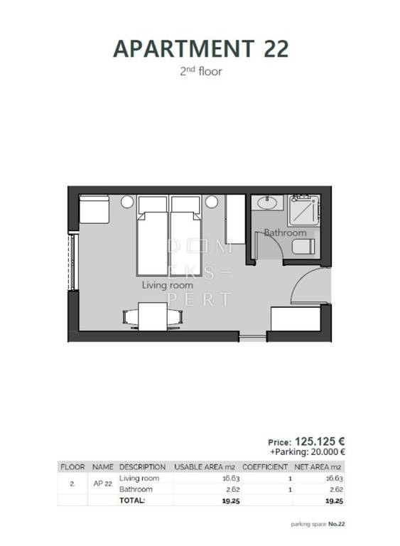 Zgrada se sastoji od prizemlja i dva kata. Površina apartmana je 19.25 m². Odličnog je i funkcionalnog rasporeda, pun svjetla, luksuzno opremljen.