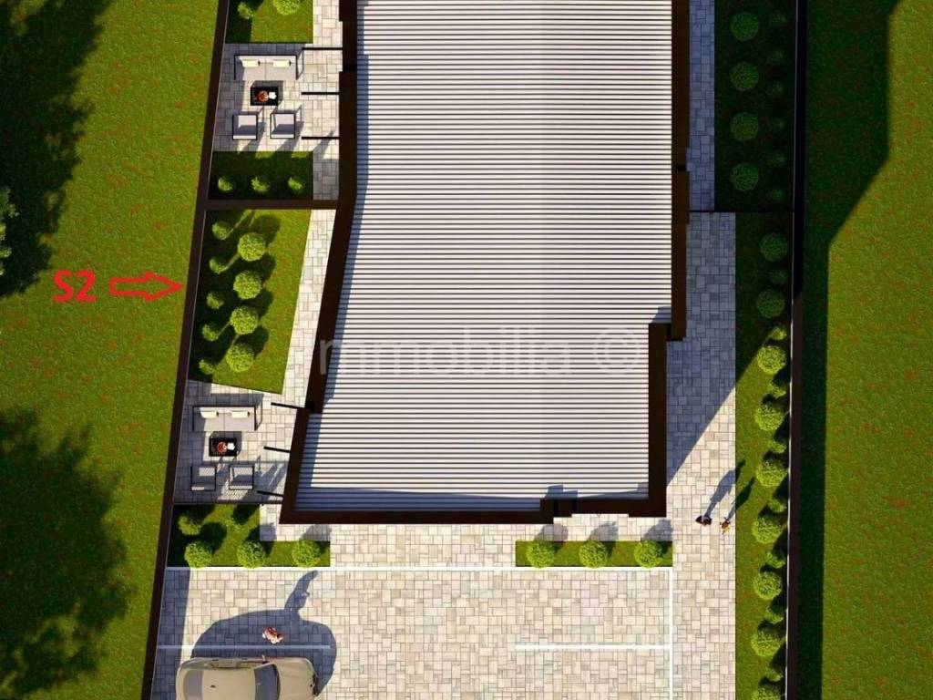 2 manja apartmana od cca 55 m2 u prizemlju sa vlastitim vrtovima te 1 veliki apartman od 120 m2 (3 spavaće sobe) na 1.katu i još jedan identičan veliki apartman od 120 m2 (3 spavaće sobe) na 2.katu.