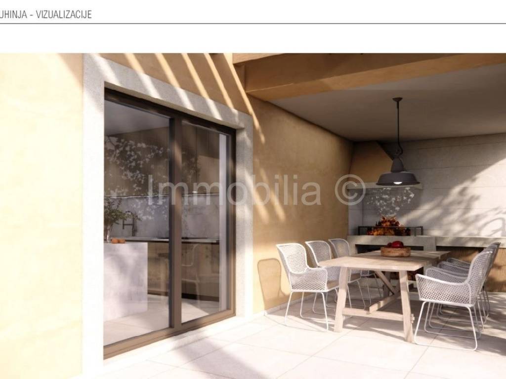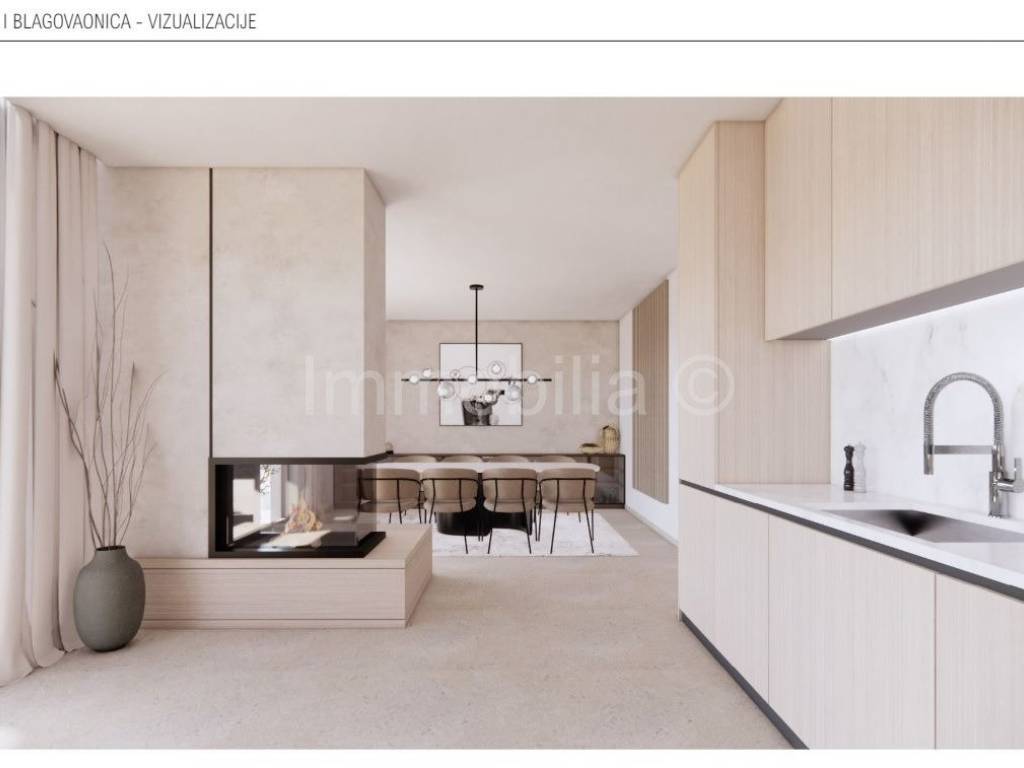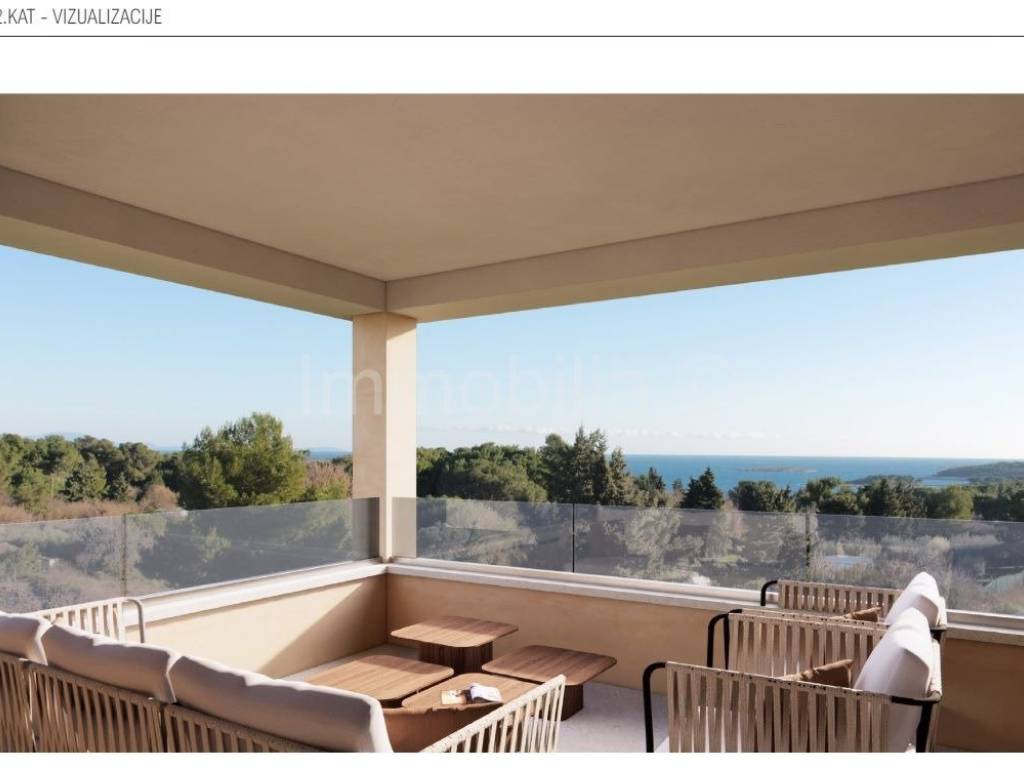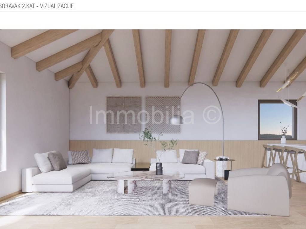 U prizemlju se nalaze dnevni boravak , kuhinja i blagovaonica , kupaonica i 1 spavaća soba , na 1. katu se nalaze 2 velike spavaće sobe sa kupaonicama i velikim terasama, a 2.kat se sastoji od velike open space prostorije sa kupaonicom i izlazom na veliku natkrivenu terasu sa fantastičnim neometanim pogledom na more. Ovaj 2.kat može se urediti u dodatni dnevni boravak sa fantastičnim pogledom ili u master bedroom, teretanu , wellness...